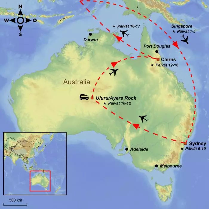 Koe Australian kiehtovimmat kontrastit. Matkusta maan kahdesta suurimmasta kaupungista – Melbournesta ja Sydneystä – punaisen aavikon keskellä kohoavalle Ulurulle. Vietä matkan viimeiset päivät trooppisessa Cairnsissa ja näe Iso valliriutta tai maailman vanhin sademetsä.