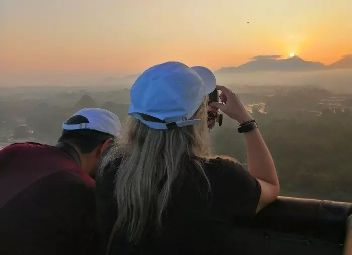 Kun kaikki on valmista, astut koriin ja lähdet nousemaan kohti taivasta yhtä matkaa auringon kanssa. Nouseva aurinko värjää maiseman upeilla keltaisen ja oranssin sävyillä, mutta ilma tuntuu edelleen viileältä.