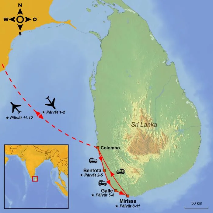 Saapuessasi hieman pääkaupunki Colombon pohjoispuolelle, kuljet maahantulotarkastuksen läpi ja haet matkatavarasi. Saapumishallissa sinua odottaa opas, joka on valmis ottamaan sinut vastaan TourCompass-kyltti kädessään aidolla srilankalaisella vieraanvaraisuudella. Tämän jälkeen edessäsi on vajaan kahden tunnin ajomatka Bentotan upeille rannoille, jotka ulottuvat kilometreittäin hienon vaalean hiekan peittäminä Sri Lankan lounaisrannikolla.
