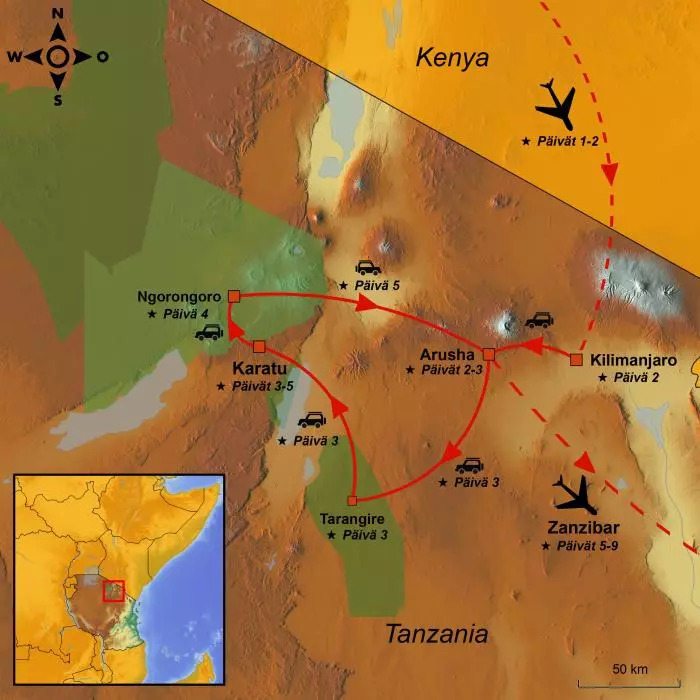 Matka alkaa valitulta lentokentältä, mistä lennät välilaskun/-laskujen kautta Tansaniaan.