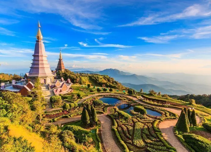 Seuraava kohde on ihastuttava, hyvin hoidettu puutarha, jonka kahden mahtavan pagodin kultaiset suippotornit kohoavat kohti taivasta. Pagodit pystytettiin kuningas Bhumibol Adulyadejin (Rama IX) ja hänen vaimonsa muistoksi. Selkeällä säällä näköalat ovat uskomattoman kauniita: ikivihreät metsät näyttävät kuin vuoren rinteelle levitetyiltä pörheiltä matoilta!