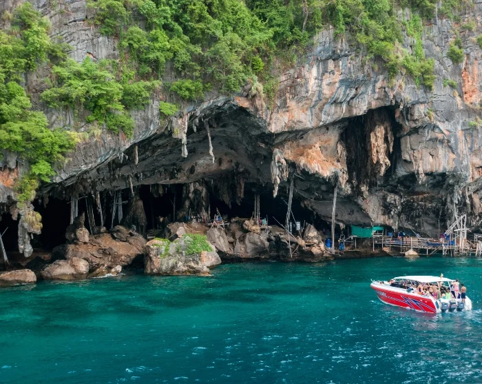 Tämän jälkeen matka jatkuu veneellä Pileh Laguunille, joka on yksi Thaimaan vaikuttavimmista maisemista. Laguunia ympäröivät jyrkät kalkkikivikalliot, jotka kohoavat kirkkaan turkoosista merestä. Perinteiset longtail-veneet keinuvat rauhallisesti laguunissa ja luovat täydellisen postikorttimaiseman. Voit pulahtaa virkistävään veteen suoraan veneestä ja nauttia viehättävistä maisemista.