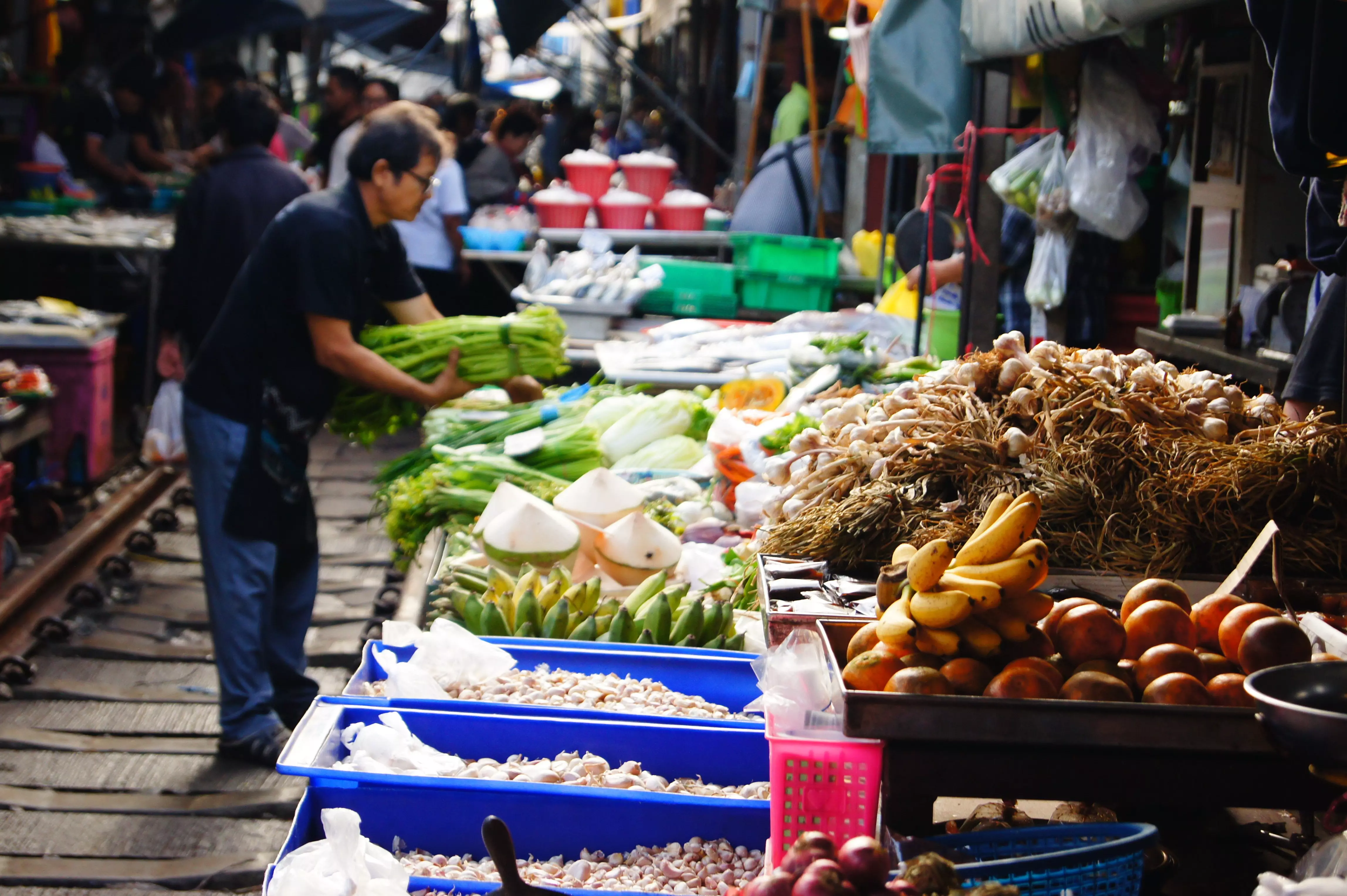 Hieman yli tunnin ajomatkan jälkeen saavutte Maeklongiin, jossa pääset tutustumaan vilkkaaseen torielämään, jossa monenlaiset tuotteet, kuten tuoreet hedelmät, vihannekset, mausteet, liha, kala ja matkamuistot vaihtavat omistajaa. Torin erikoisin piirre on se, että se levittäytyy osaksi rautatien poikki. Junan lähestyessä torikansa ohjataan punaisten viivojen taakse. On hauska nähdä, kuinka torimyyjät taittavat markiisinsa ja kojunsa näppärästi pois junan tieltä ja pystyttävät ne tuossa tuokiossa uudelleen. Jos aika riittää, kävelette Maeklongin pääteasemalle, josta juna lähtee takaisin tulosuuntaansa. Lyhyen matkan päässä rautatieasemalta on pieniä viehättäviä kojuja, joille turistit eivät eksy ja joista voit ostaa jääkahvia, thaimaalaista teetä tai perinteistä thaimaalaista khanom krok -jälkiruokaa.