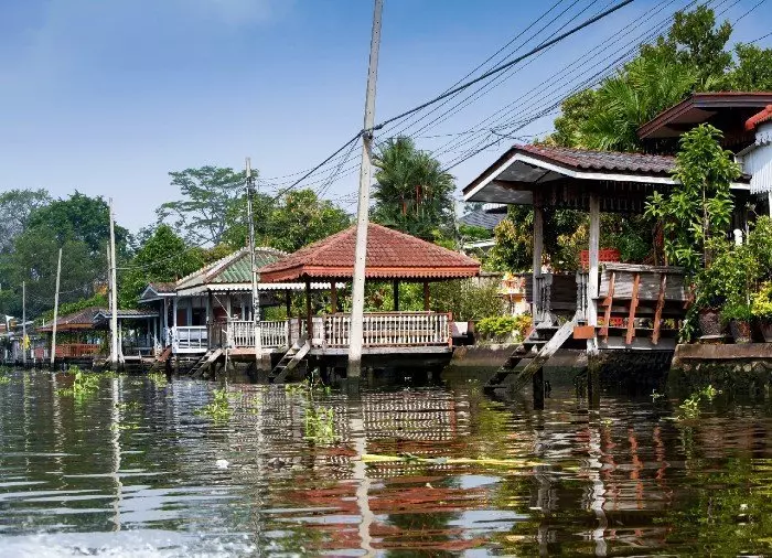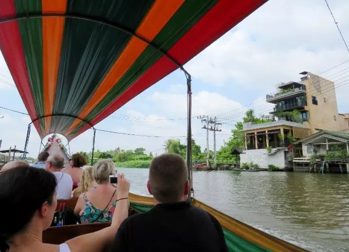 Museokierroksen jälkeen kävellään lyhyt matka Chao Phraya -joelle, jota kuninkaiden joeksikin kutsutaan, ja perillä nouset perinteiseen pitkähäntäveneeseen. Vene kuljettaa sinut Länsi-Bangkokiin tunnelmalliseen Thonburin kaupunginosaan lukemattomien kanavien eli ”klongien” muodostaman labyrintin läpi. Jokapäiväinen kaupankäynti Bangkokissa tapahtui ennen vanhaan pääasiassa kanavissa ja niiden varrella, minkä ansiosta eurooppalaiset kauppamatkustajat antoivatkin Bangkokille lempinimen ”Idän Venetsia”. Tänä päivänä näiden rauhaa huokuvien ja ainutlaatuisen viehättävien vesiteiden merkitys paikallisväestölle on edelleen suuri. Kanavien varsille on rakennettu pilarien päällä keikkuvia taloja, joista johtavat pienet portaat veteen. Voit nähdä asukkaiden pesevän portailla pyykkiään tai hiuksiaan. Verannoilla istuskelevat pikkulapset ja mummot odottelevat postivenettä tai ohi seilaavaa jäätelönmyyjää. Tämä Bangkokin kaupunginosa on kaikin tavoin täysi vastakohta ydinkeskustan tiheälle rakennuskannalle, pilvenpiirtäjille, kohoradoille ja moottoriteille.