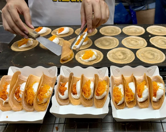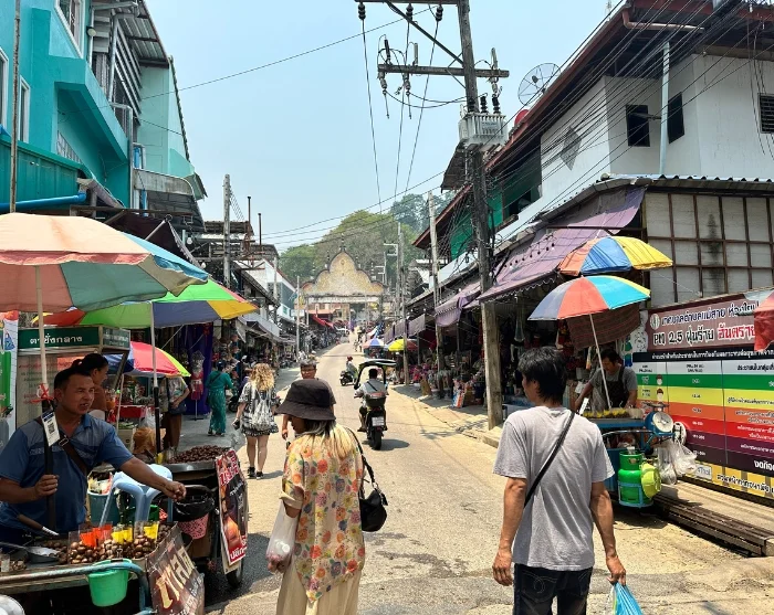 Seuraava etappi on paikallinen iltatori, missä on aikaa kierrellä katselemassa myyntikojuja. Täällä tutustut paikallisiin herkkuihin, kuten haudutettuun possunjalkaan (khao kha mu), kookosvanukkaaseen ja tahmeaan riisiin kananmunalla (bua loi khai waan).