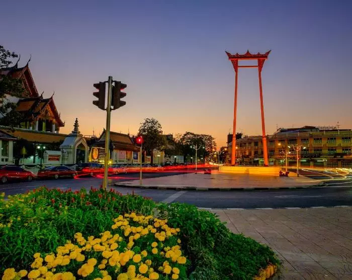 Tuk-tukissa matka jatkuu 27 metriä korkean Giant Swingin ohi, joka on merkittävä kulttuuri maamerkki Wat Suthat Thepwararam -temppelin vieressä.