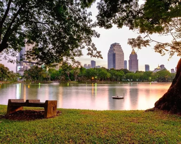 Kuljettuasi Bangkokin läpi trooppisessa kuumuudessa ja vilkkaassa liikenteessä, saattaa tulla hetkiä, jolloin haaveilet vihreämmistä ja rauhallisemmista paikoista. Voit ottaa tilaisuuden vierailla vaikkapa Lumpinin tai Benjakitin puistoissa. Voit myös suunnata joen länsipuolelle, jossa kohtaat täysin toisenlaisen maailman ilman pilvenpiirtäjiä ja tööttääviä tuk-tukkeja. Täällä kohtaat perinteisen Bangkokin sekä sokkeloisen kanavaverkoston, jossa on paaluille rakennettuja taloja ja postimiehet kulkevat veneillä.