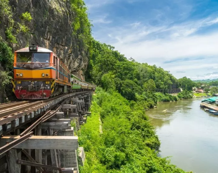 Sinut noudetaan hotellilta jo varhain aamulla, jotta vältettäisiin pahimmat liikenneruuhkat Bangkokista lähtiessä. Matka taittuu autolla suoraan Kanchanaburiin ja Kwai-joelle. Täällä rakennettiin toisen maailmansodan aikana Thaimaasta Myanmariin johtavaa rautatietä varsin epäinhimillisissä olosuhteissa. Yli 400 kilometrin pituisen radan rakentaminen vei 18 kuukautta, ja vuosien 1942–1943 aikana rakennustyöt aiheuttivat noin 100 000 aasialaisen pakkotyöläisen ja noin 12 500 liittoutuneiden sotavangin kuoleman. Pierre Boulle kertoi radanrakentajien tarinan romaanissaan Kwai-joen silta, jonka perusteella myöhemmin kuvattiin klassikon asemaan noussut samanniminen elokuva.