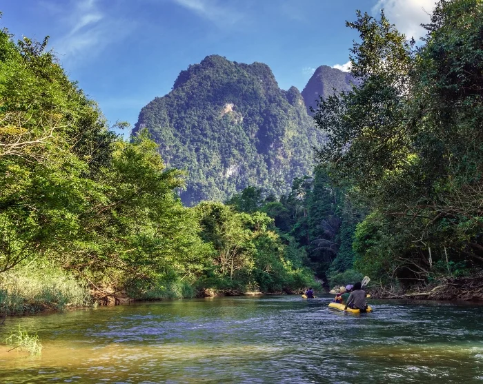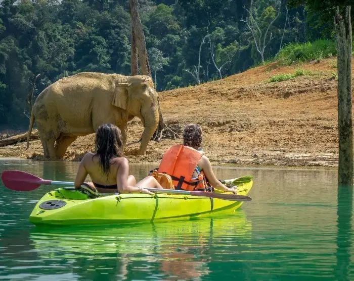 Matka Donsakin laiturilta Khao Sokiin kestää noin 2 tuntia ja 45 minuuttia. Hotellille saavuttaessa edessäsi on rauhallinen melontaretki Sok-joella. On ainutlaatuista lipua hiljalleen joen virtauksen mukana ja aistia ympäröivän sademetsän tunnelma. Kalkkikivikallioiden dramaattiset muodot ja rehevä luonto tarjoavat upeita näkymiä. Puunlatvoissa soi lintujen laulu, ja aivan joen reunamilla saattaa nähdä iguaanin vilahtavan pensaikossa. Parasta on, että voit vain nojautua taaksepäin ja nauttia maisemista – paikallinen opas hoitaa melomisen puolestasi.