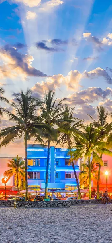 Tiedät heti, että lähestyt Miamia, kun kaupunkimaisema ja sen suuret rakennukset, suuret autot ja risteilyalukset alkavat korvata laajat näkymät merelle. Yövyt Miami Beachillä, joka tunnetaan kirkkaanvärisistä art deco -taloistaan, rannastaan ja kuuluisan Collins Avenue kaupoistaan.