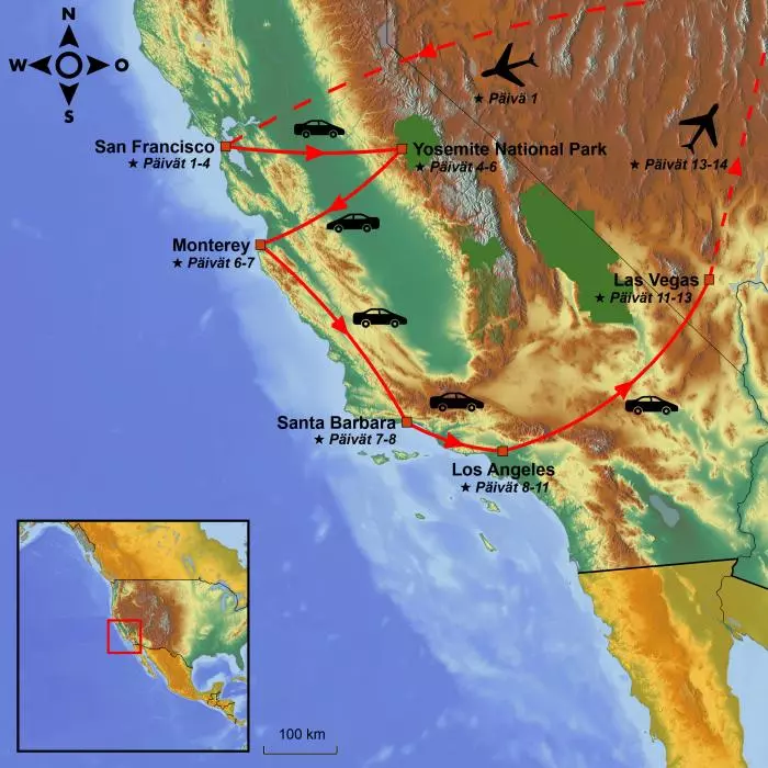 Koe Kalifornian upeimmat kaupungit ja luontokohteet pohjoisesta etelään: San Francisco, Yosemite, Highway 1, Los Angeles ja lopuksi rantakaupunki San Diego.