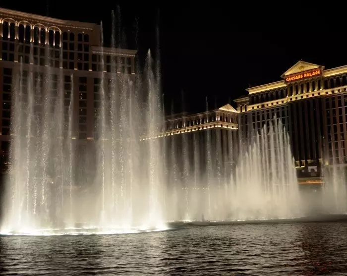 Saapuessasi teemahotelliisi on vaikeaa olla hymyilemättä monien vilkkuvien pelikoneiden näkymälle lukuisien toiveikkaiden pelaajien istuessa pelaamassa. Kirjaudu sisään hotelliin, pulahda uima-altaaseen ja nauti illasta jossakin kaupungin lukuisista ravintoloista. Voit pysähtyä jo tänä iltana kuuluisalla suihkulähteellä vuonna 1998 avatun Bellagio-hotellin edessä. Hotelli on avaamisestaan lähtien tuottanut vaikuttavia vesiesityksiä klassisen musiikien tahteihin ohikulkijoiden iloksi.