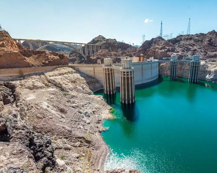 Noin 45 minuuttia ennen Las Vegasiin saapumista kannattaa poiketa katsomassa mahtavaa Hooverin patoa. Coloradojoen halkaiseva Hoover Dam on vaikuttava rakennelma, jonka korkeus on peräti 221 metriä ja pituus 379 metriä. Se sijaitsee aivan Arizonan ja Nevadan välisellä rajalla, ja osavaltioiden välistä tunnin aikaeroa havainnollistetaan tänne pystytetyllä valtavalla kellolla.