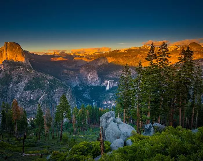 Kesäkaudella yksi ehdottomista vierailukohteista on Glacier Point -näköalapaikka, jossa voit nauttia upeista panoraamanäkymistä vuorille ja vesiputouksille. Kannattaa saapua paikalle juuri ennen auringonlaskua, sillä auringon punaiseksi värjäämä Half Dome -huippu on todella hieno näky. Pian auringonlaskun jälkeen pääset ihastelemaan tähtitaivasta, joka tuntuu avautuvan aivan pään yläpuolella täällä 2 200 metrin korkeudessa. Jos matkaat paikalle päiväsaikaan bussilla (yhdensuuntainen lippu varataan Visitor Centeristä), voit kävellä takaisin kaunista Four-Mile-Trail -reittiä pitkin.