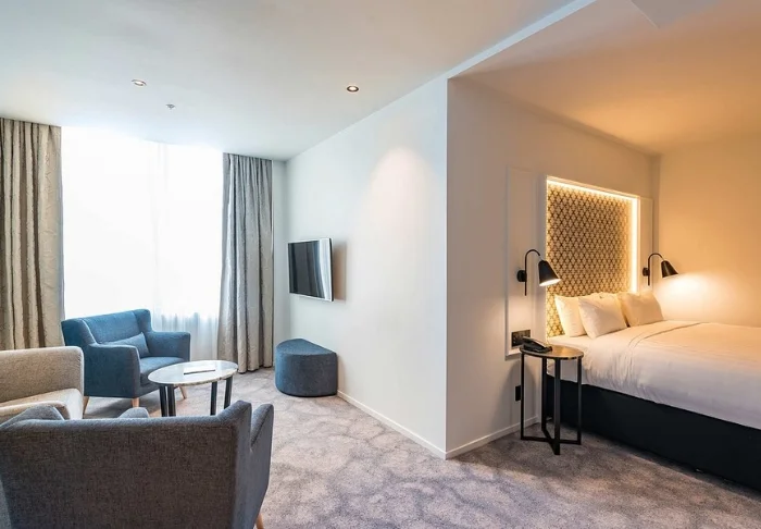 Hotellin sisustus on moderni ja tyylikäs, painottaen mukavuutta ja kestävyyttä. Hotellissa on yhteensä 86 huonetta, joissa jokaisessa on oma kylpyhuone sekä minibaari, tallelokero, smart-TV, kirjoituspöytä, vedenkeitin sekä teen- ja kahvin valmistusvälineet. Luonnollisesti käytössäsi on myös ilmainen WiFi koko oleskelusi ajan.