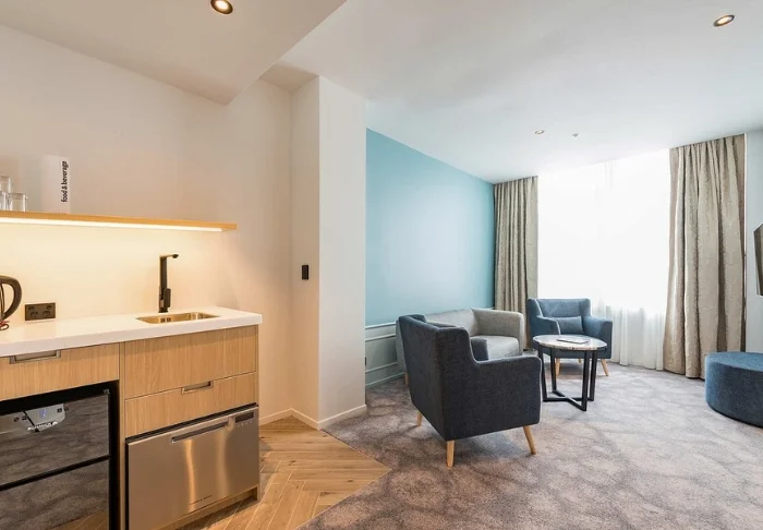 Lisämaksusta on mahdollista päivittää huone kaksio-sviittiin, joka on tilavampi, sisältää kaksi makuuhuonetta sekä täysin varustellun keittiön (majoitustilaa neljälle hengelle).