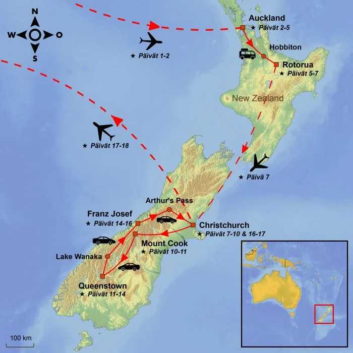 Matka alkaa Aucklandista Pohjoissaarella, Uuden-Seelannin vilkkaasta metropolista, jota ympäröivät meri ja vulkaaniset kukkulat. Täältä matka jatkuu sisämaahan lumoavaan Hobbitoniin, jossa Taru sormusten herrasta -elokuvien lavasteet vievät sinut satumaisen maailman tunnelmaan. Rotoruassa sinua odottavat vaikuttavat geotermiset ilmiöt: kuplivat mutalammikot, kuumat lähteet sekä aito maorikulttuuri.