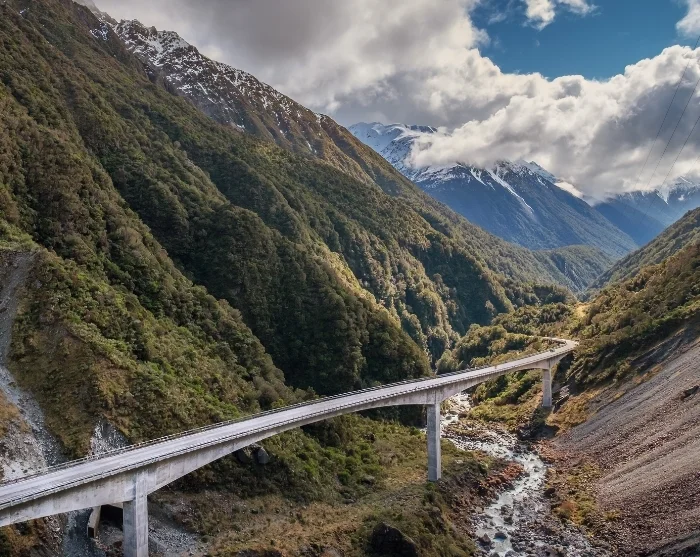 Hokitikan jälkeen matka jatkuu Kumara Junctioniin, jossa käännyt itään Highway 73:lle ja aloitat nousun kohti Arthur’s Passin kansallispuistoa. Maisema muuttuu täällä vahvasti: sademetsä vaihtuu alppipensaikkoon ja vuoret kohoavat ympärilläsi. Otira Viaduct Lookout -näköalapaikalta avautuu upea näkymä vaikuttavalle viaduktille, joka kiemurtelee laakson läpi. Pidä silmät auki myös vikkelän kean, maailman ainoan alppipapukaijan varalta – näitä uteliaita papukaijoja nähdään usein parkkipaikan tuntumassa.