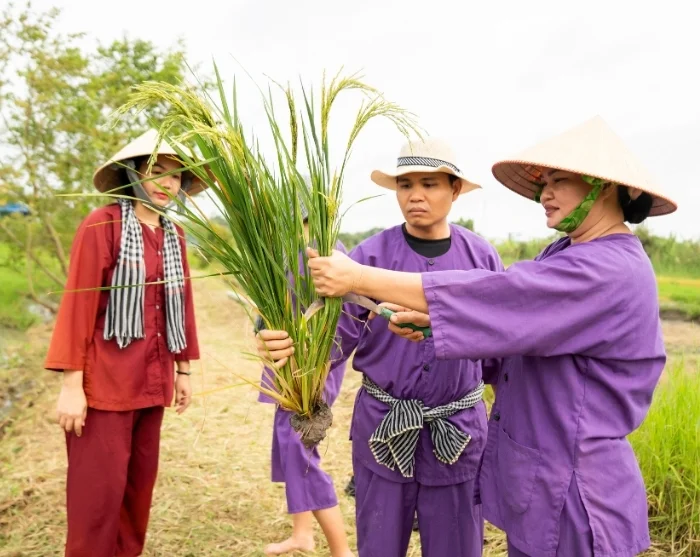 Sen jälkeen jatkat matkaa Vinh Longiin, jossa kumppanimme on käynnistänyt sosiaalisesti kestävän kehityksen hankkeen. Kuljet kylän halki oppaan kanssa – rauhallinen kävely antaa sinulle mahdollisuuden tutustua hankkeen tavoitteisiin ja käytännön toteutukseen. Saat myös kokeilla perinteistä maatalon arkea, kun yhdessä kyläläisten kanssa pääset osallistumaan riisiviljelyyn – esimerkiksi istuttamalla taimia tai auttamalla sadonkorjuussa, ajankohdasta riippuen. Tämä käytännönläheinen ja opettavainen kokemus avaa ainutlaatuisen näkymän Vietnamin maaseudun elämään ja siihen työhön, jonka varassa kestävä viljely lepää. Osallistumalla retkelle tuet samalla Vinh Longin perheitä, sillä osa matkan hinnasta ohjataan suoraan projektille, josta voit lukea lisää täältä.