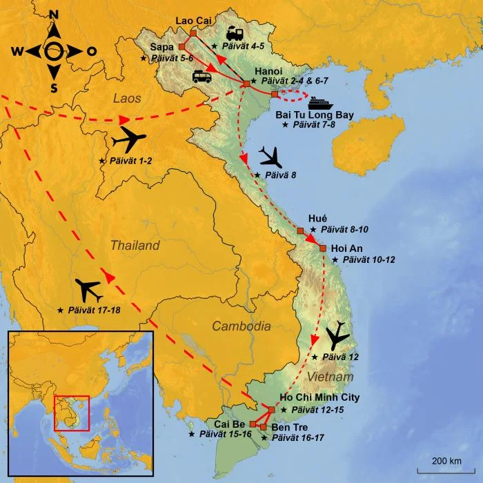 Koe seikkailullinen kiertomatka koko Vietnamin läpi vuoristoisesta Sapasta ja vilkkaasta pääkaupungista Hanoista keisarillisiin kaupunkeihin, viehättäviin rannikkokaupunkeihin, rehevään Mekongin suistoon ja sykkivään Ho Chi Minhin kaupunkiin.