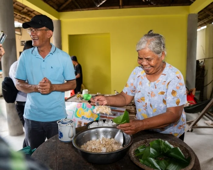 Tuk-tuk kuljettaa sinut kylän rauhallisia teitä pitkin ja ensimmäinen pysähdys on paikallisen perheen luona, missä saat maistaa com depiä (vihreitä riisihiutaleita) ja näet, miten popriisiä valmistetaan.