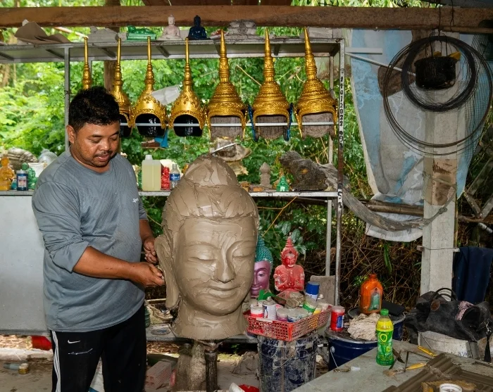 Matka jatkuu lahjakkaan khmer-taiteilijan luokse, joka valmistaa patsaita ja naamioita alueen pagodeihin.