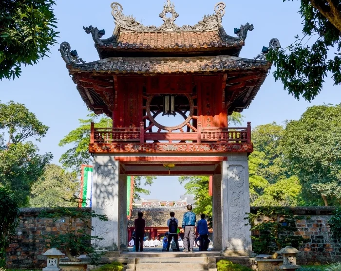 Seuraavaksi ajetaan katsomaan Kirjallisuuden temppeliä, rauhaisaa kompleksia, jonka rakensivat 1100-luvulla kiinalaisen filosofin Kungfutsen oppilaat. Lähes tuhatvuotias temppeli on harvinainen ja hyvin säilynyt esimerkki perinteisestä vietnamilaisesta arkkitehtuurista, johon kuuluvat pylväskäytävät, lammet ja vihreät sisäpihat. Nuoret opiskelijat tulevat tänne edelleen rukoilemaan onnea tentteihinsä.
