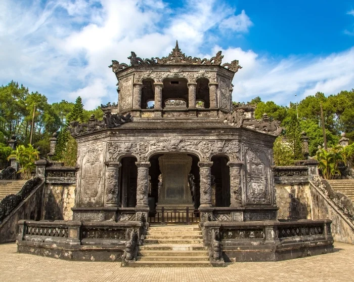 Seuraavaksi kierros jatkuu keisari Khai Dinhin haudalle, joka eroaa merkittävästi alueen muista keisarien haudoista. Hautakompleksi rakennettiin 1900-luvun alussa, ja se yhdistää perinteisiä vietnamilaisia elementtejä eurooppalaiseen barokkiin ja goottilaiseen tyyliin. Tuloksena on loistelias, upeita yksityiskohtia vilisevä arkkitehtoninen kokemus, joka on kunnianosoitus kuolleelle keisarille ja kertoo hänen kiinnostuksestaan länsimaista taidetta ja kulttuuria kohtaan.